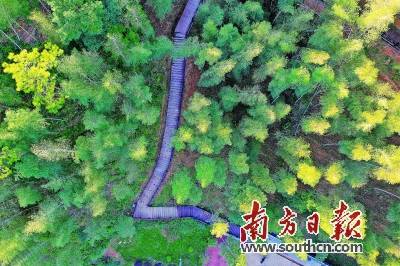 氣勢(shì)浩然的竹海、竹材搭建的棧道在朝陽下交織,繪成一幅優(yōu)美的冬日畫卷。丘林強(qiáng) 攝